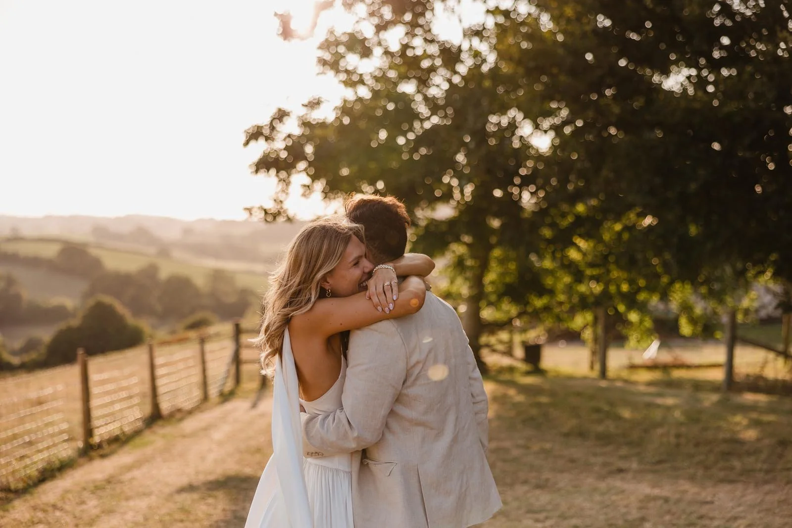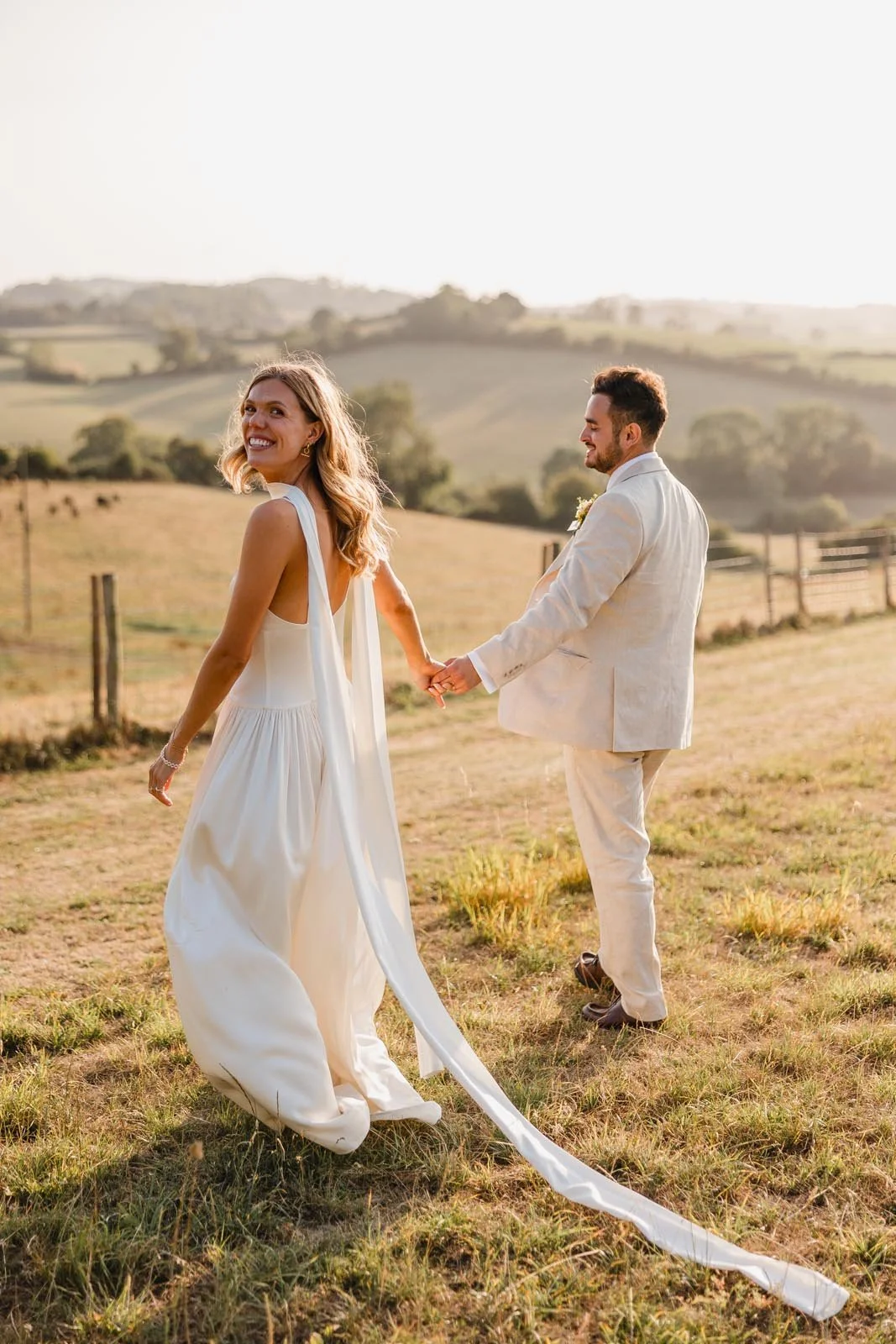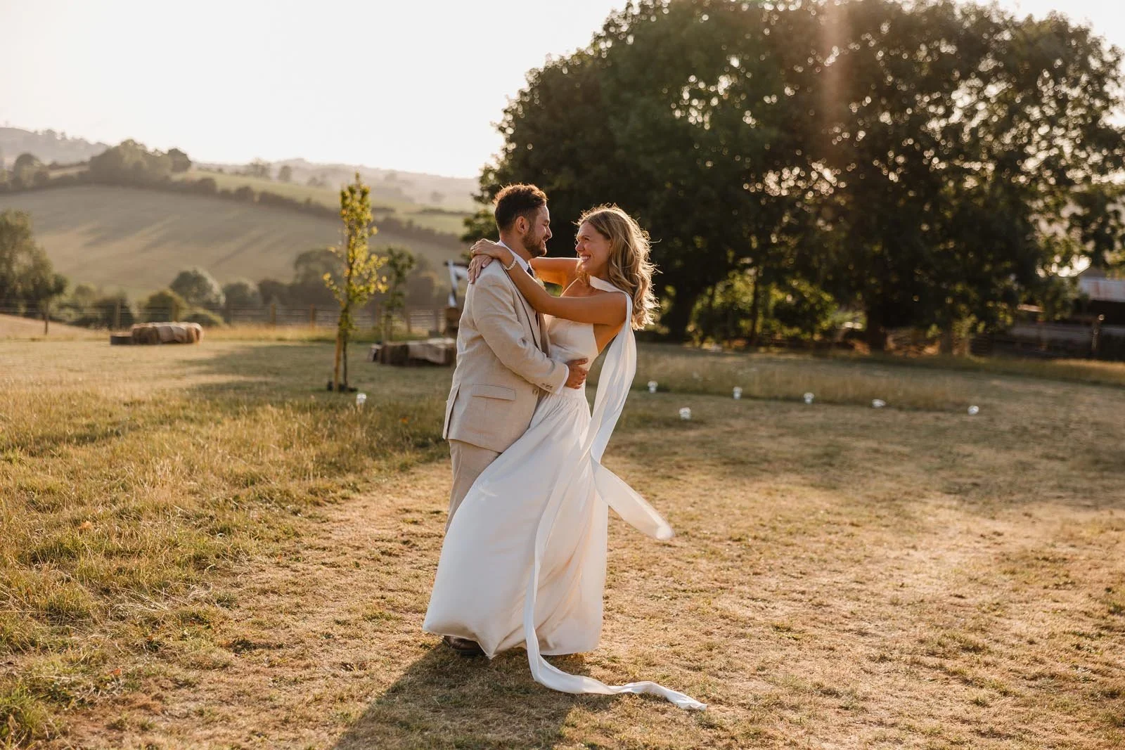 As the afternoon drifted into evening, the light turned that perfect golden shade the Cotswolds does so well. We slipped away for ten minutes of couple portraits in the fields, and honestly, those are always some of my favourite photos of the day. No awkward posing. Just movement, laughter, and that we just got flipping married glow.