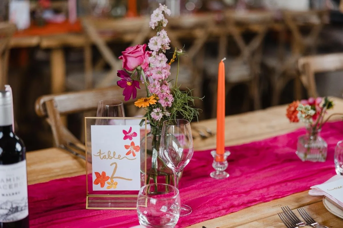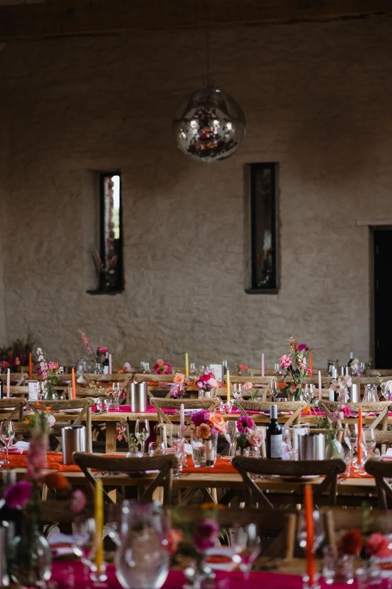 I have to say, pink and orange together is one of my favourite colour combinations to photograph. It’s bold, modern and unapologetically joyful. The bridesmaids wore orange dresses, carrying bouquets bursting with bold colourful flowers. The reception space continued the theme with colourful table settings, layered napkins, glowing taper candles and playful stationery. Every detail felt intentional yet effortlessly fun.